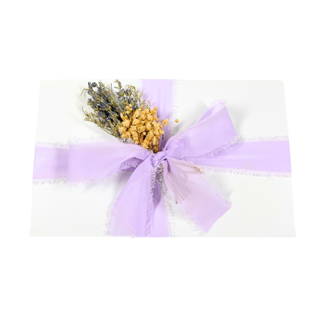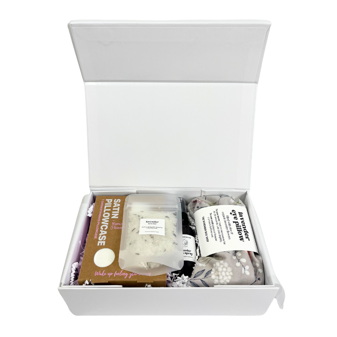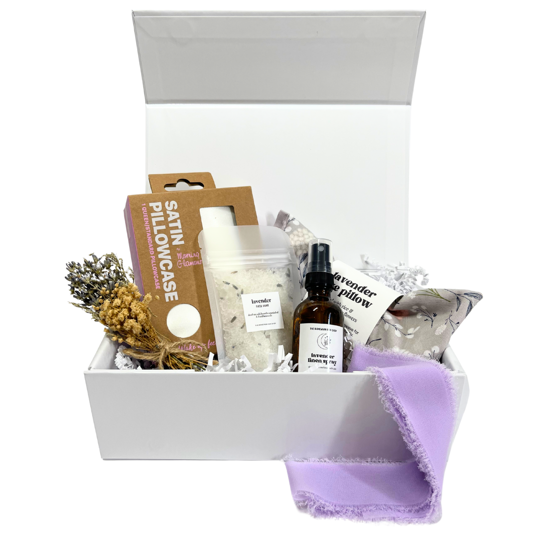 Beautifully presented in a white magnetic closure gift box with white shred and tissue paper, this thoughtful gift is tied with a soft lavender satin ribbon and topped off with a charming mini lavender bundle. It's the perfect gift for relaxation and indulgence, ideal for unwinding after a long day.