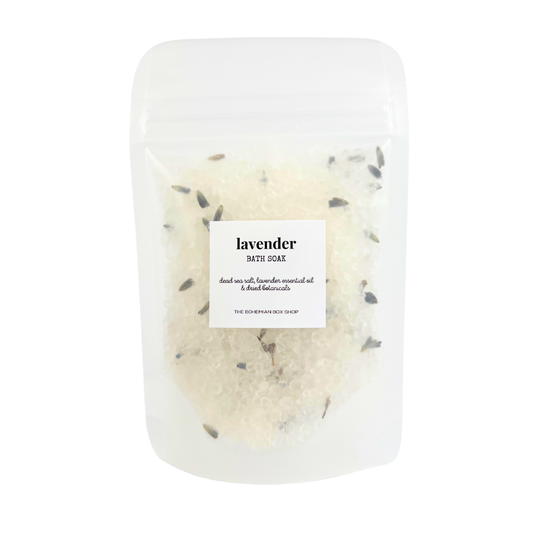 Lavender bath salts, infused with natural lavender essence, to create a soothing and calming bathing experience.